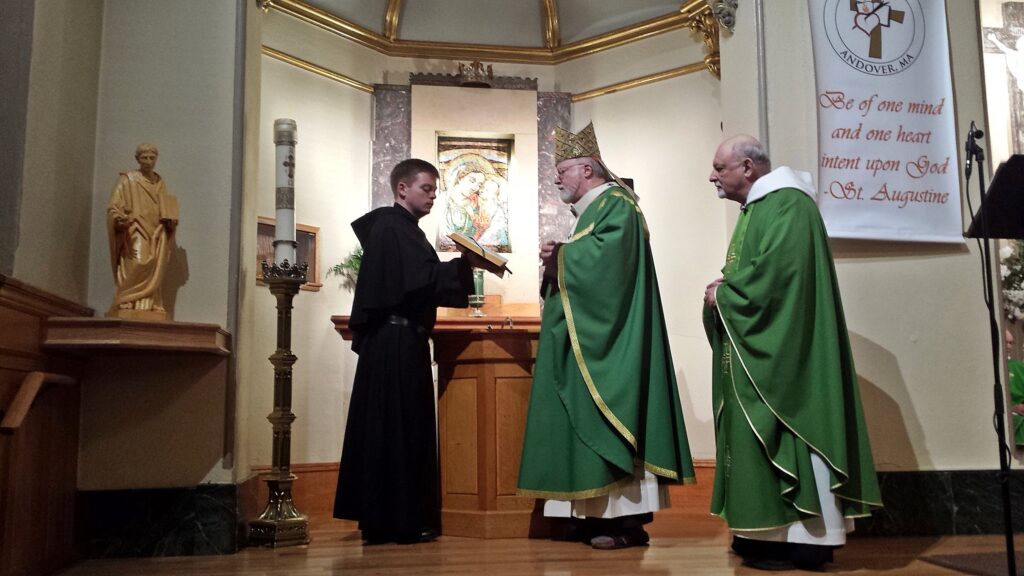 Sean Cardinal O’Malley, OFM Cap., and Prior Provincial Michael Di Gregorio, O.S.A., bless a new statue of Saint Augustine, following the anniversary Mass at the parish in Andover, Massachusetts..